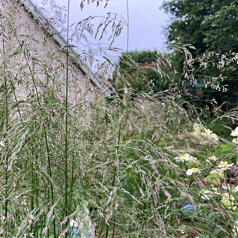 Ornamental grasses are ideal for use as ground cover and their seed heads can provide added interest throughout autumn and winter. Deschampsia cespitosa ‘Goldschleier’ is a perennial evergreen that has fine arching blue-green leaves. From late spring or early summer, it produces flower stems with golden colour flowers that have a silvery sheen. I tend to leave the flowering stems, but you can cut them down in late spring. Height 90cm and 60cm spread.