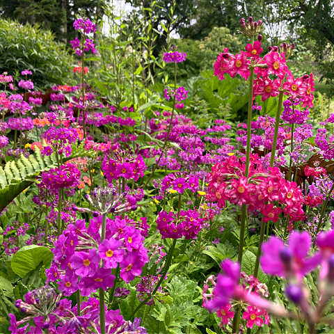 A group of hybridised primulas that offer a range of colours. They can continue to cross-pollinate with other primulas and provide more colours in the garden. The leaves grow from a basal rosette and the flower stems rise in late spring and early summer with layers, or whorls of flowers. They range in height from 40cm to 100cm. Grow in loam or clay, acid or neutral, poorly drained soil. They prefer partial shade and are unfussy about aspect. They will grow in full sun as long as the soil does not dry out. Hardy in UK, Ireland and northern Europe. To propagate, divide in spring.