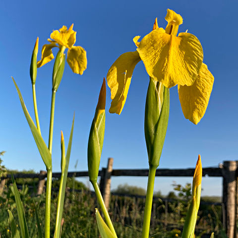 This may be a common sight in gardens and river banks, but the yellow flag iris certainly deserves consideration in a bog garden. The bright yellow flowers appear in late spring, followed by large seed pods. Grow in loamy or clay, acidic soil that is poorly drained, or in the shallows of a pond. They thrive in full sun and partial shade, particularly in a south- or east-facing position. Height 150cm. These native irises are fully hardy throughout UK, Ireland and Europe. The leaves usually die back in late summer and reappear in spring.