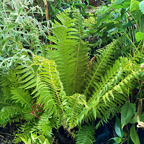Commonly known as the shuttlecock fern, it grows to 150cm height and spreads readily through suckering. Grow in damp soil, in partial shade or even full shade, in any soil type except chalky soil. It prefers a sheltered site, and is hardy across the UK and Ireland. I have this growing in full sun in a bed that does not remain continually moist and it grows well enough, but doesn’t reach much more than 80cm in height. This year I have moved some of plants to a shadier and damper spot and will watch with interest, to see how they respond to their preferred growing conditions.