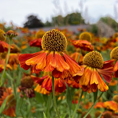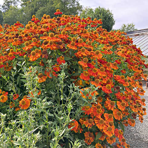 Helenium flowers from mid-summer to mid-autumn with a riot of bright daisy-like flowers that have a red, orange and yellow petals around a dark centre. Varieties offer a range of sizes from knee high to towering. ‘Septemberfuchs’ grows to 150cm – 170cm height and 150cm spread. Unfussy about soil type or situation, it prefers a west- or south-facing site. It is hardy throughout UK and Ireland, even during the most severe winters. Deadhead regularly to prolong the flowering period.