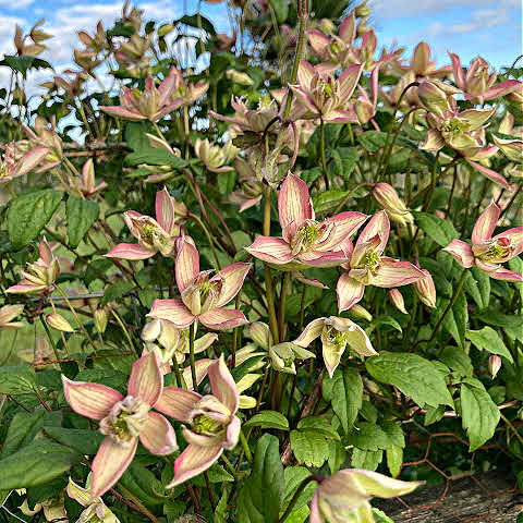 I planted this Clematis to grow over the porch of a home during the late 1980s and I’m delighted to have it again. In our current garden, it scrambles over a fence between a formal orchard and an informal forest garden. Like most Clematis montana, it is a vigorous, clinging climber that produces a mass of flowers in late spring and early summer. While ‘Marjorie’ is not known as having particularly fragrant blossoms, I think they have a light vanilla scent. Height 600cm (19ft8in). If you need to prune to keep it within an allotted area, do so immediately after flowering.
